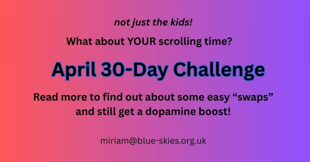 Where does scrolling usually happen? In bed? While the TV is on? Or at the dining table? Play a game with your partner to see who can last the longest with their phone in another room! You could designate these as phone-free areas to improve sleep and connection. Some shows – such as Line of Duty might mean you need to watch carefully so scrolling isn’t an option. Or a little trick is to turn the TV volume down and the subtitles on, so that you put your phone in a different location and do one activity at a time.